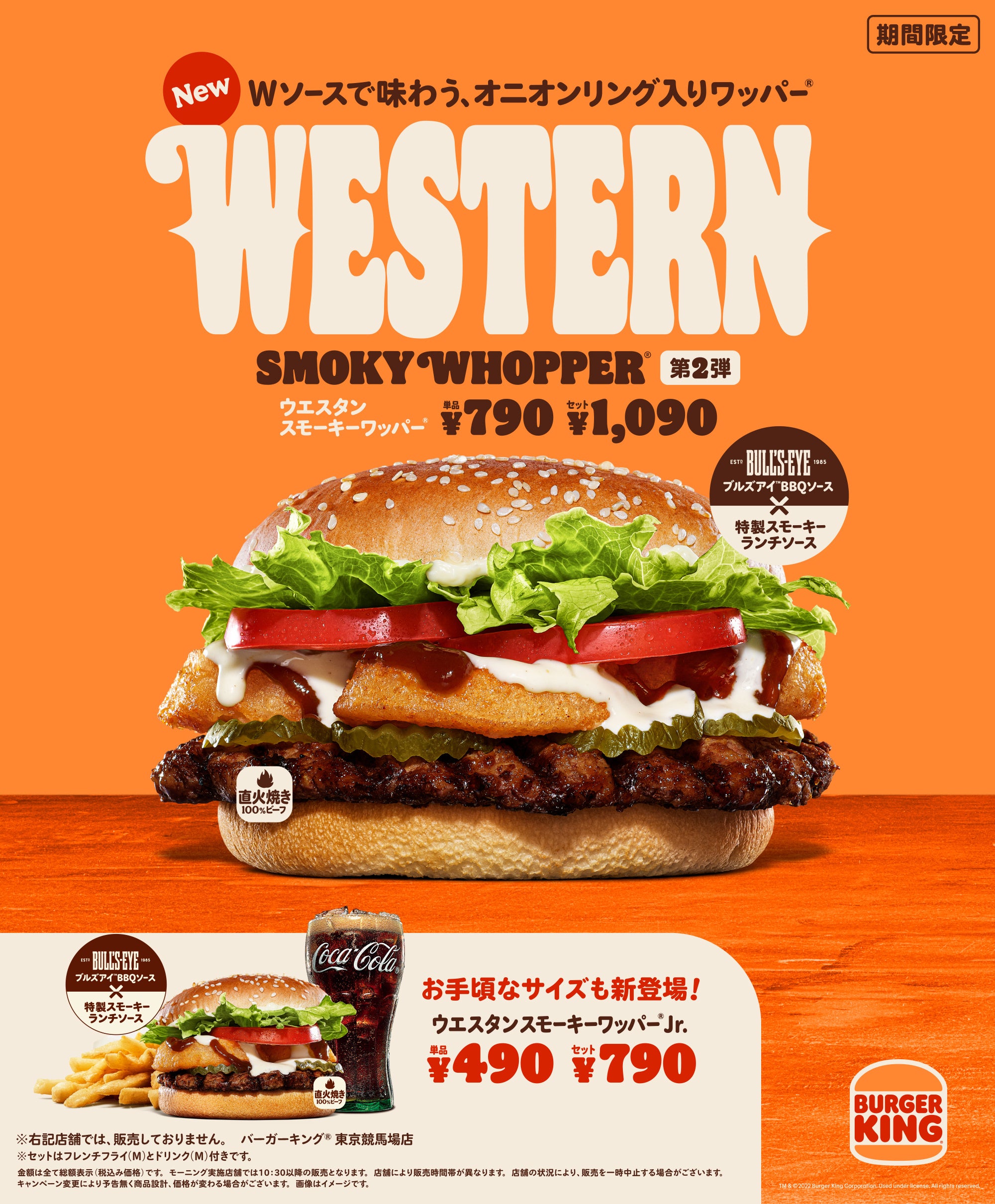 バーガー好きの皆様、このたびバーガーキング® が新開発した特製「スモーキーランチソース」と、BBQの本場アメリカで誕生した「ブルズアイ™ BBQソース」の本格ダブルソースが、直火焼きの100%ビーフパティとオニオンリングのおいしさを引き立てる『ウエスタン スモーキーワッパー® 』をぜひお試しいただき、今までにない本場の味をご体験ください。