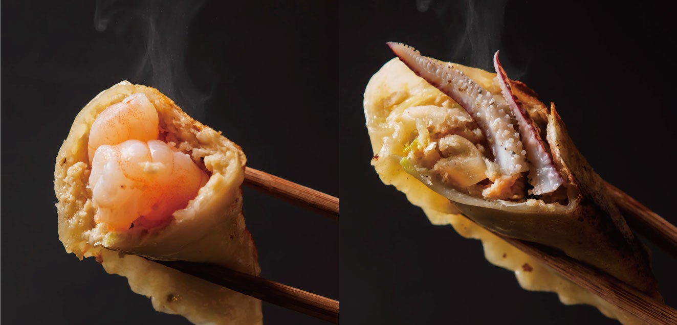 天ぷらにも使われる大きめの海老を丸々2尾使用し、ぷりぷりの身を溢れるくらいに詰めた餃子です。蓮根や長芋を入れた餡との相性も抜群です。よく焼いていただけば、皮の“かりっと”、海老の“ぷりっと”、根菜の“こりっと”の、3つの異なる食感が一度に楽しめます。レモン汁で召し上がっていただくのもおすすめです。