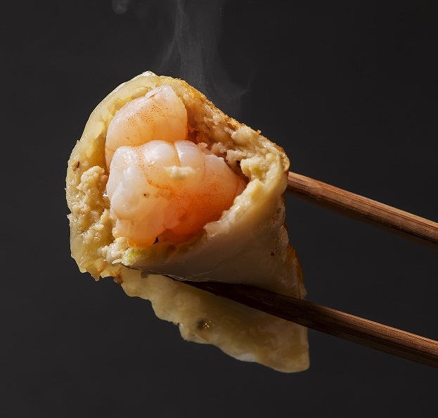 天ぷらにも使われる大きめの海老を丸々2尾使用し、ぷりぷりの身を溢れるくらいに詰めた餃子です。蓮根や長芋を入れた餡との相性も抜群です。よく焼いていただけば、皮の“かりっと”、海老の“ぷりっと”、根菜の“こりっと”の、3つの異なる食感が一度に楽しめます。レモン汁で召し上がっていただくのもおすすめです。