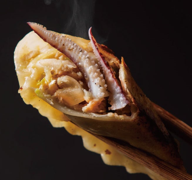 イカの旨味あふれる餡を、北海道産小麦を使ったもちもち食感の皮で包みました。餡は、新鮮なイカを大きめにカットして練り込み、北海道産の豚肉と野菜を合わせています。酢醤油につけて召し上がるのがおすすめです。