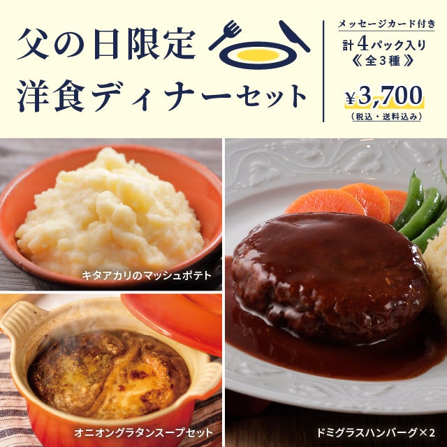 セット内容:ドミグラスハンバーグ x 2、キタアカリのマッシュポテト x 1、オニオングラタンスープセット x 1『≪父の日限定≫レンジで簡単セット』(4種4品) 3,800円 ※価格は税込、送料込み