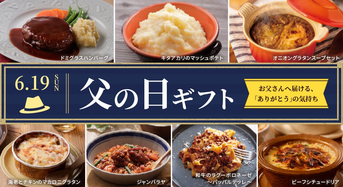 セット内容:ドミグラスハンバーグ x 2、キタアカリのマッシュポテト x 1、オニオングラタンスープセット x 1『≪父の日限定≫レンジで簡単セット』(4種4品) 3,800円 ※価格は税込、送料込み