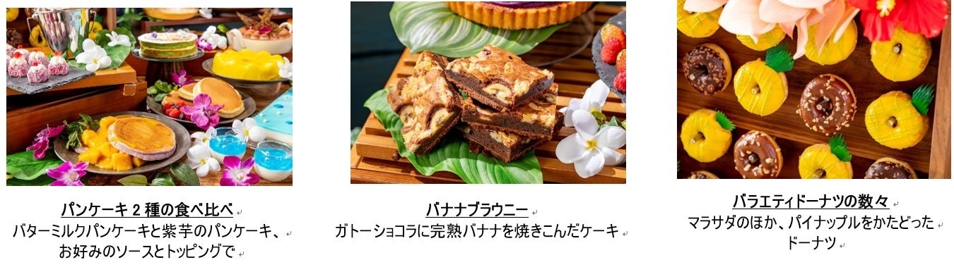 スイーツ:パイナップルムース、ココナッツムース、ダックワーズパッション、紫芋のモンブラン、クグロフショコラ“ボルケーノ”、マンゴーショート、カフェムース、ココナッツタルト、パイナップルタルト、バナナチョコブラウニー、レミントンフランボアローズ、マカダミアナッツ入りカップケーキ、マラサダ、ドーナツ、マンゴープリン、ハイビスカスジュレ、ブルーハワイジュレ