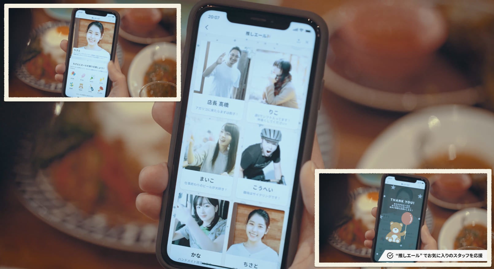 「推しエール」は、スタッフに感謝や応援の気持ちを送る「投げ銭」機能です。スマートフォンの画面にスタッフ一覧と投げ銭ボタンが表示され、接客の感謝の気持ちとしてチップを送ることができます。