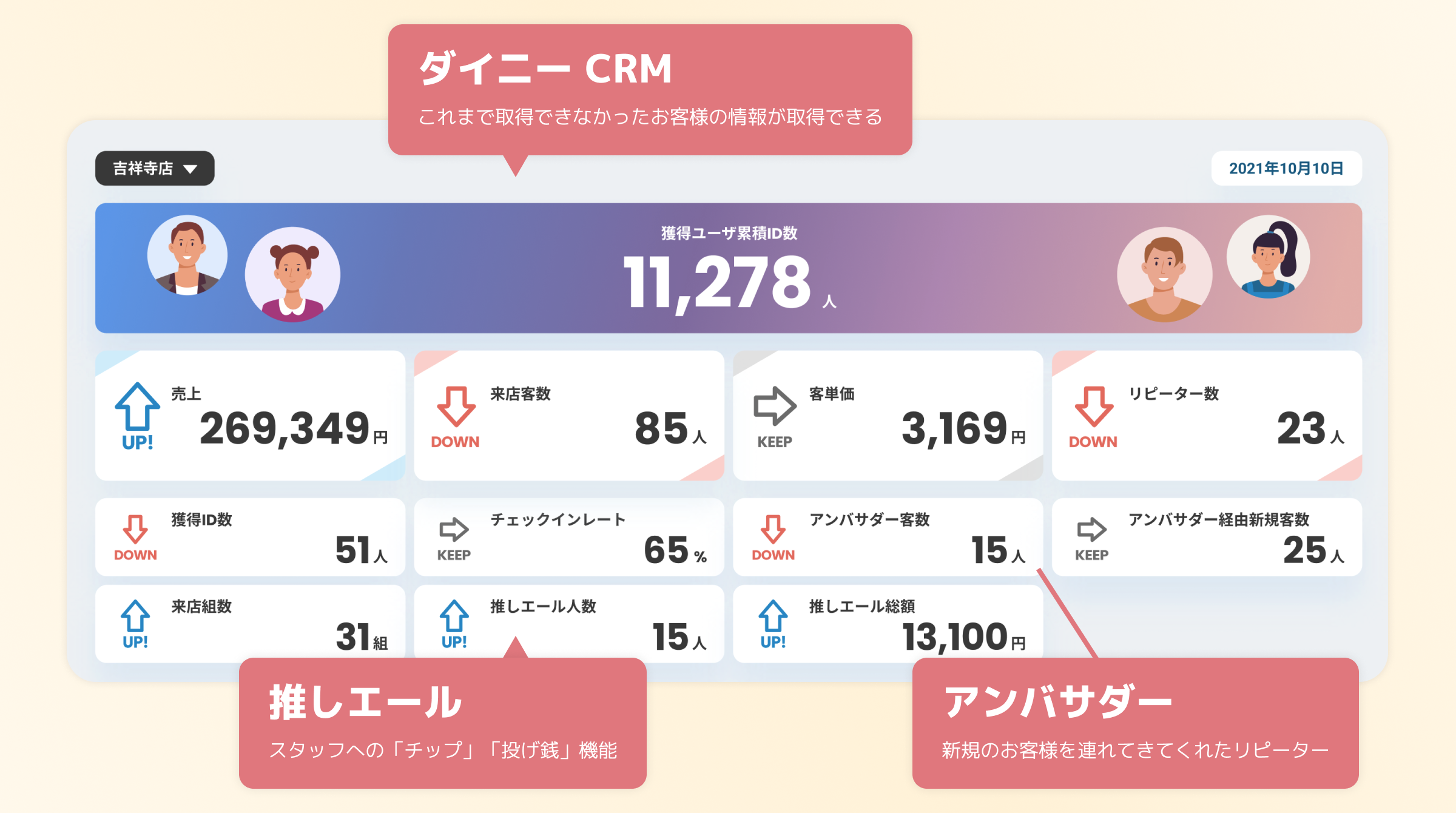 「新規客数・リピーター客数・アンバサダー客数」が一目でわかるようになり、仮説や感覚でしか撃つ手が無かった飲食店の経営に新たな先行指標経営が完成します。