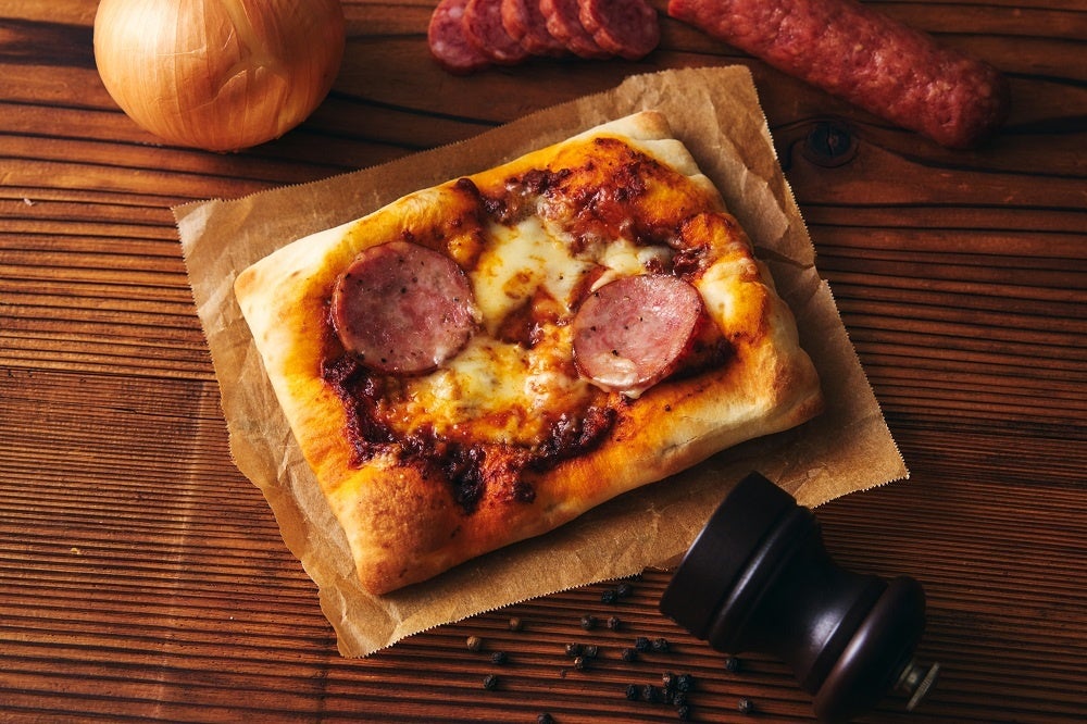 今回発売する「ピッツァ ボロネーゼ」は、外はカリっと香ばしく、中はもっちりとした食感のナポリ風のピザ生地に、トマトの酸味と玉ねぎの甘みを感じられる旨み豊かなミートソース、さらにソフトサラミをトッピングしたシンプルな中にも食べごたえのある本格的ピッツァです。ランチや一息つきたい軽食時、さらには軽めの夕食にも、時間を選ばずお召しあがりいただけるオススメの一品です。プラントベースのドレッシングを使用したグリーンミニサラダとあわせてお楽しみください。