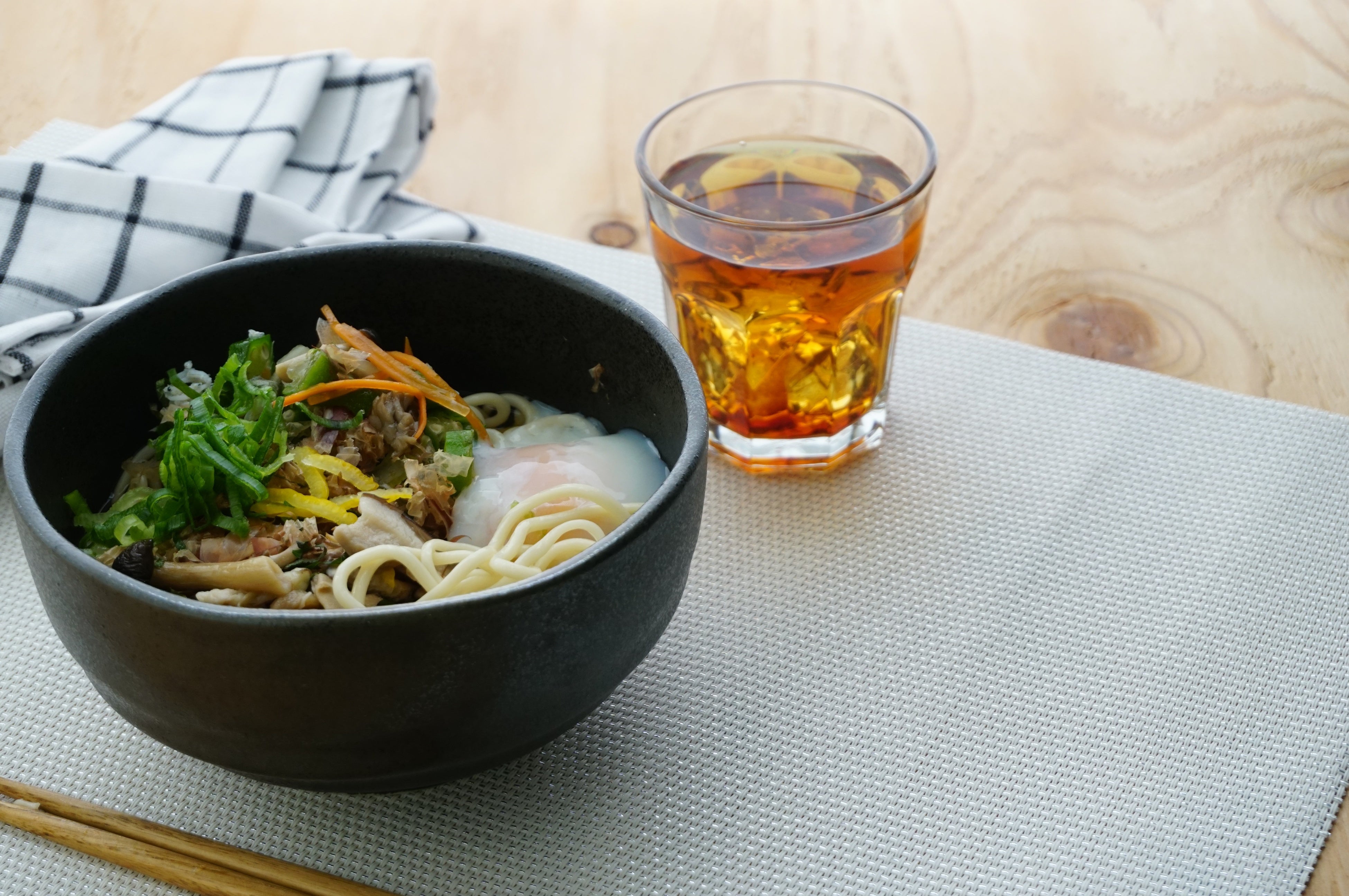 暖かくなるこれからの時期にぴったりな冷やしうどんです。新上五島町で獲れたあごからとった上質な「あごだし」と、日本三大うどんのひとつである「五島うどん」を使用しています。自家製のうどんつゆは、あごだし、みりん、醤油、たまり醤油などで旨味が詰まった味わいに。そこに、艶がありつるりと喉ごしの良い五島うどん、4種類のきのこ(椎茸、舞茸、しめじ、えのき)と、3種類の薬味(大葉、茗荷、柚子)を組み合わせました。温泉卵を加えることで、よりまろやかな味わいに。細麺の五島うどんとうどんつゆ、そして具材と薬味をよく混ぜてお楽しみください。
