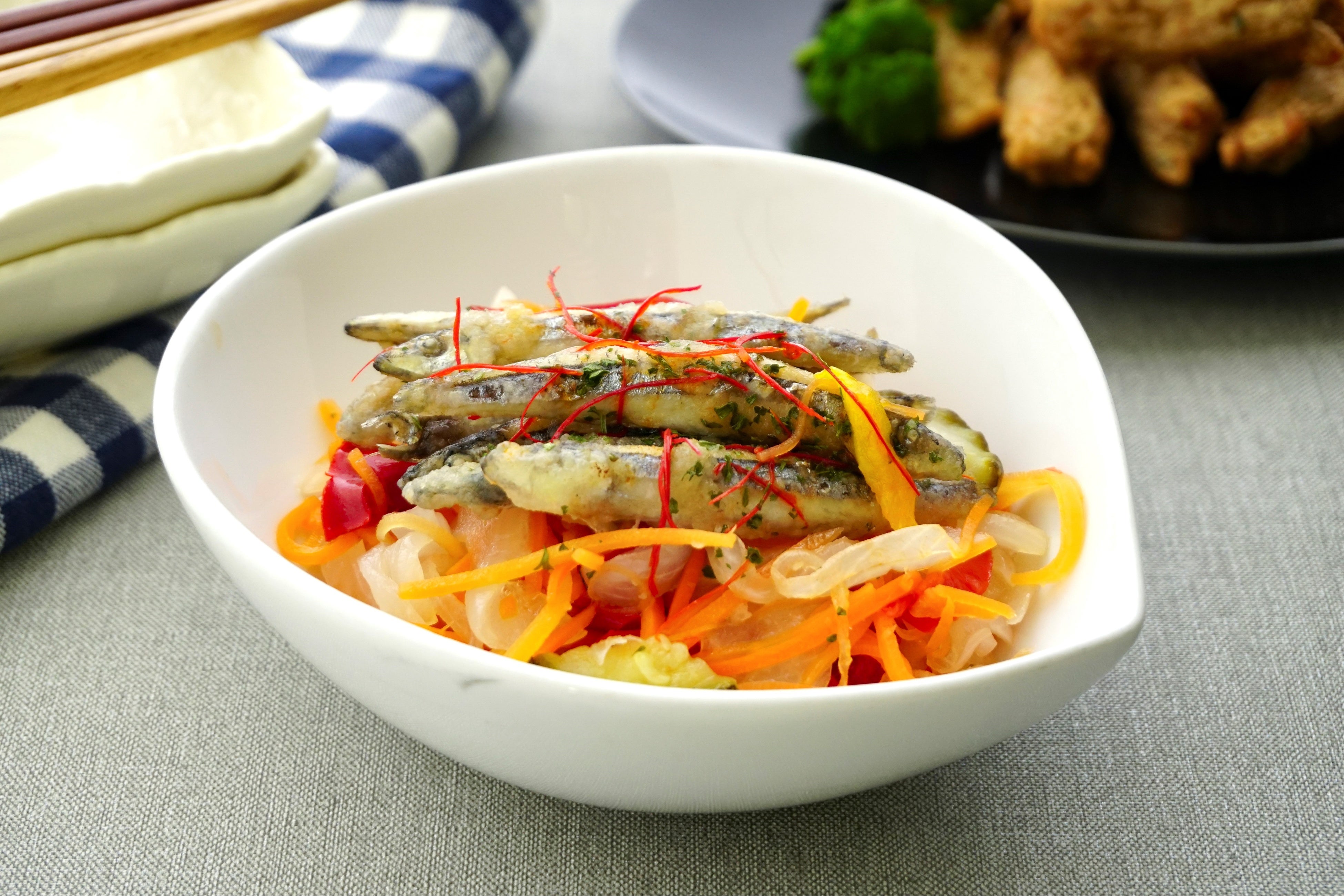 五島産のきびなごとよく合うように、レモンの酸味が効いたさっぱりとしたマリネ液を使用しています。赤・黄パプリカ、ズッキーニ、人参、玉ねぎといった色鮮やかな野菜と組み合わせています。野菜とは別にマリネしたきびなごをたっぷりトッピングし、満足感のある逸品に仕上げました。
