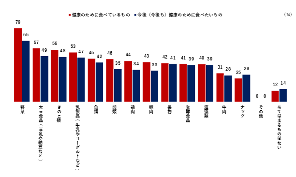 健康を意識して食べているものは「野菜」が79%と最も多い。次いで、「大豆食品(57%)」「きのこ類(56%)」が続く。今後健康のために食べたいものでも「野菜(65%)」「大豆食品(49%)」「きのこ類(48%)」が上位となった。「ナッツ」は「食べている」の回答を「今後食べたい」が上回っており、健康を意識した食品として需要が高まっていくことが考えられる。