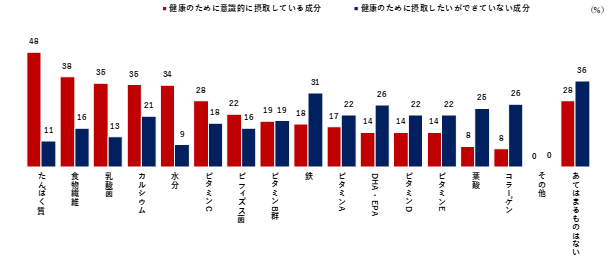 また、健康を意識して摂取している成分は「たんぱく質(48%)」が最も多く、「食物繊維(38%)」「乳酸菌(35%)」「カルシウム(35%)」が続く。一方、摂取したいが摂取できていない成分としては「鉄(31%)」「DHA・EPA(26%)」「コラーゲン(26%)」が上位となっており、需要があることがうかがえる。