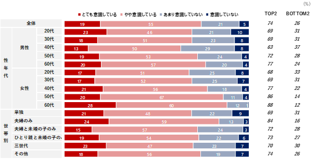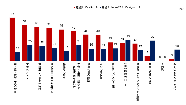普段の食生活において健康を意識している人(「とても意識している」「やや意識している」の合計)は74%となった。意識していることは「朝・昼・夜で三食の食事」が67%と最も高く、次いで「栄養バランス(55%)」「規則正しい食事の時間(53%)」が続く。一方で、意識したいができていないことは「1日の摂取カロリー(33%)」「食事の記録をとる(32%)」が高い結果となった。