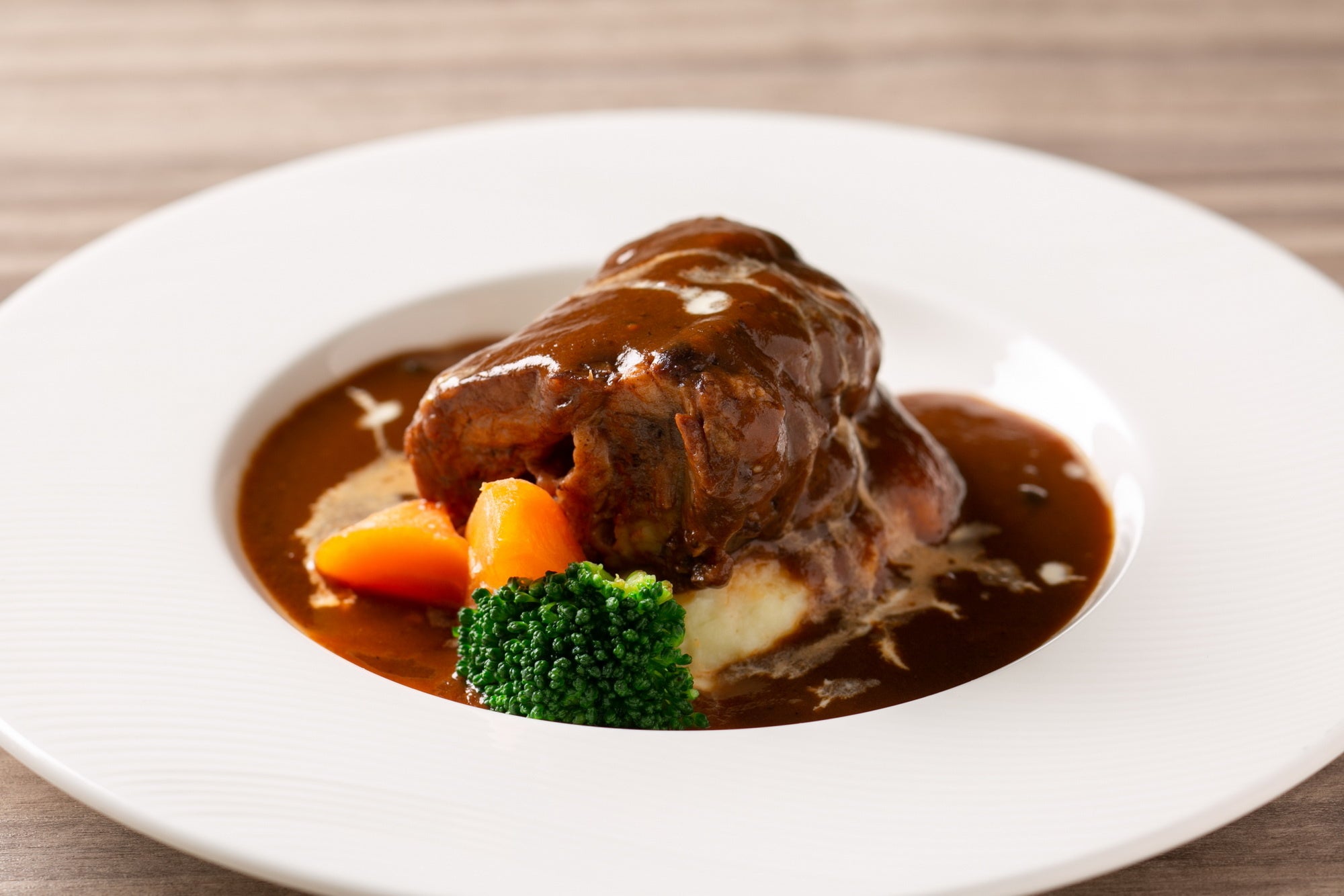 赤ワインや野菜で牛肉を長時間弱火でじっくり煮込み、黒ビールのコクをプラスして旨味を引きだしました。ホロホロとした柔らかなお肉に、甘みがある濃厚なソースと一緒に召し上がってください。