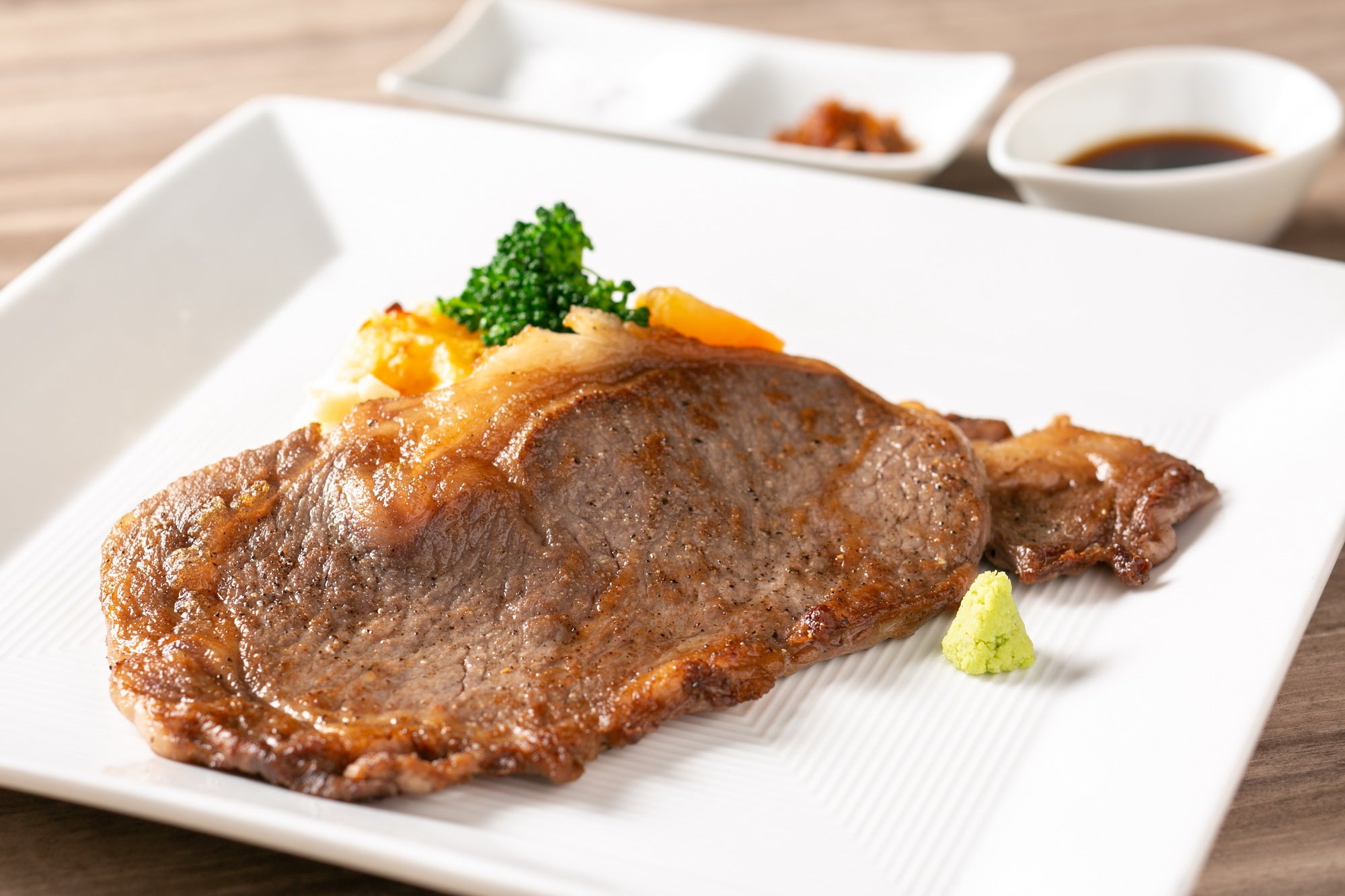 国産牛サーロインを強火で一気に焼き上げ、余熱でじんわり火を通しミディアムに仕上げました。肉本来の旨味を楽しんでいただけるよう、シンプルな3種類の味わいで召し上がってください。