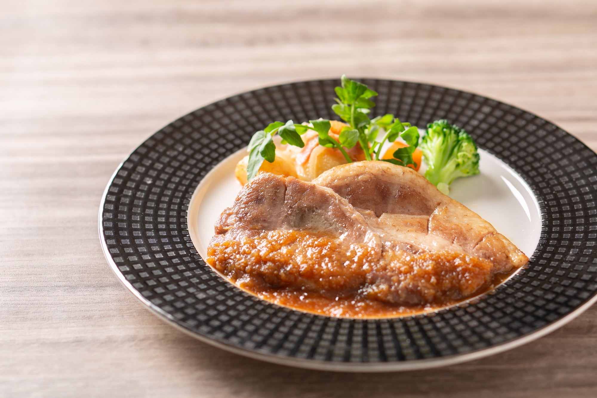 シェフこだわりの食材である、岩手県のブランド豚「岩中豚」を低温調理し、表面はカリっと焼いて、中は柔らかく仕上げました。昔ながらの生姜を使ったソースと共に召し上がってください。