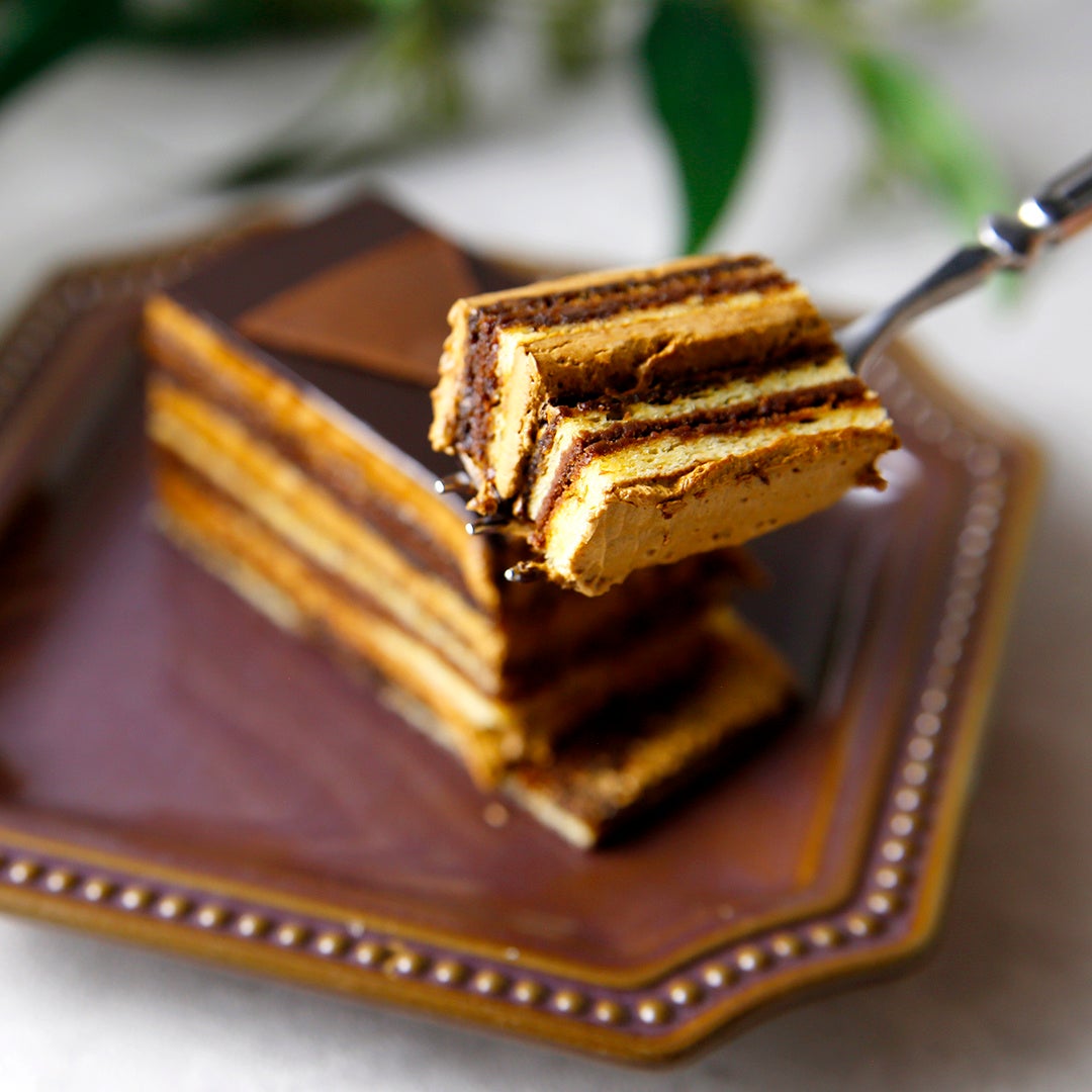 ビスキュイ生地、コーヒーシロップ、バタークリーム、ガナッシュで層を成した「オペラ」。