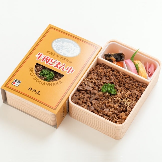 山形県産米「どまんなか」に、秘伝のタレで味付けした牛肉煮・牛そぼろ煮を盛り付けた人気のお弁当です。