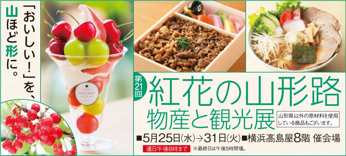 横浜高島屋では、5月25日(水)~31日(火)の期間、「紅花の山形路 物産と観光展」を開催いたします。今回の物産展では、コロナ禍で旅行等の外出を控える動きがある中注目されているどこか懐かしさを感じる「ご当地グルメ」が多数登場。そのほかにも次世代の店主たちの新たな発想が光る旬のグルメや山形県のこだわりの食材を使ったグルメなど約60店舗が揃います。