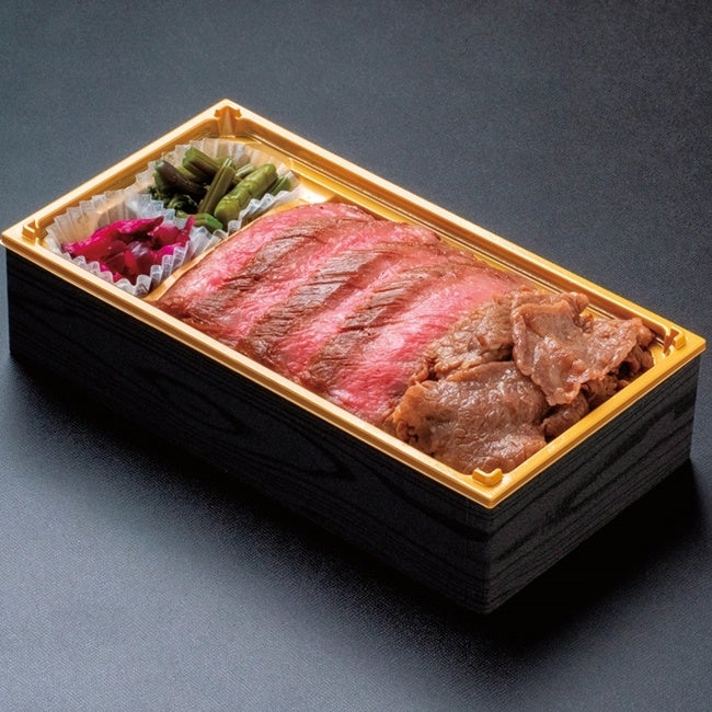 米沢牛のステーキと牛すきやきを盛り付けた豪華なお弁当。贅沢な食べ比べをお楽しみいただけます。