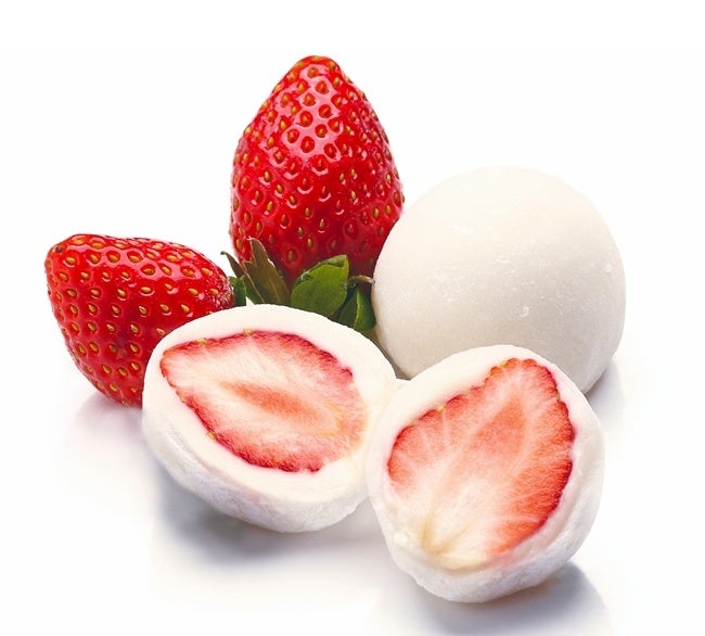 130年以上の歴史を持つ<老舗長榮堂>が作る苺大福。甘みと酸味のバランスのとれた山形県の苺ブランド「おとめ心」と練乳ミルク餡を使った季節限定の一品です。