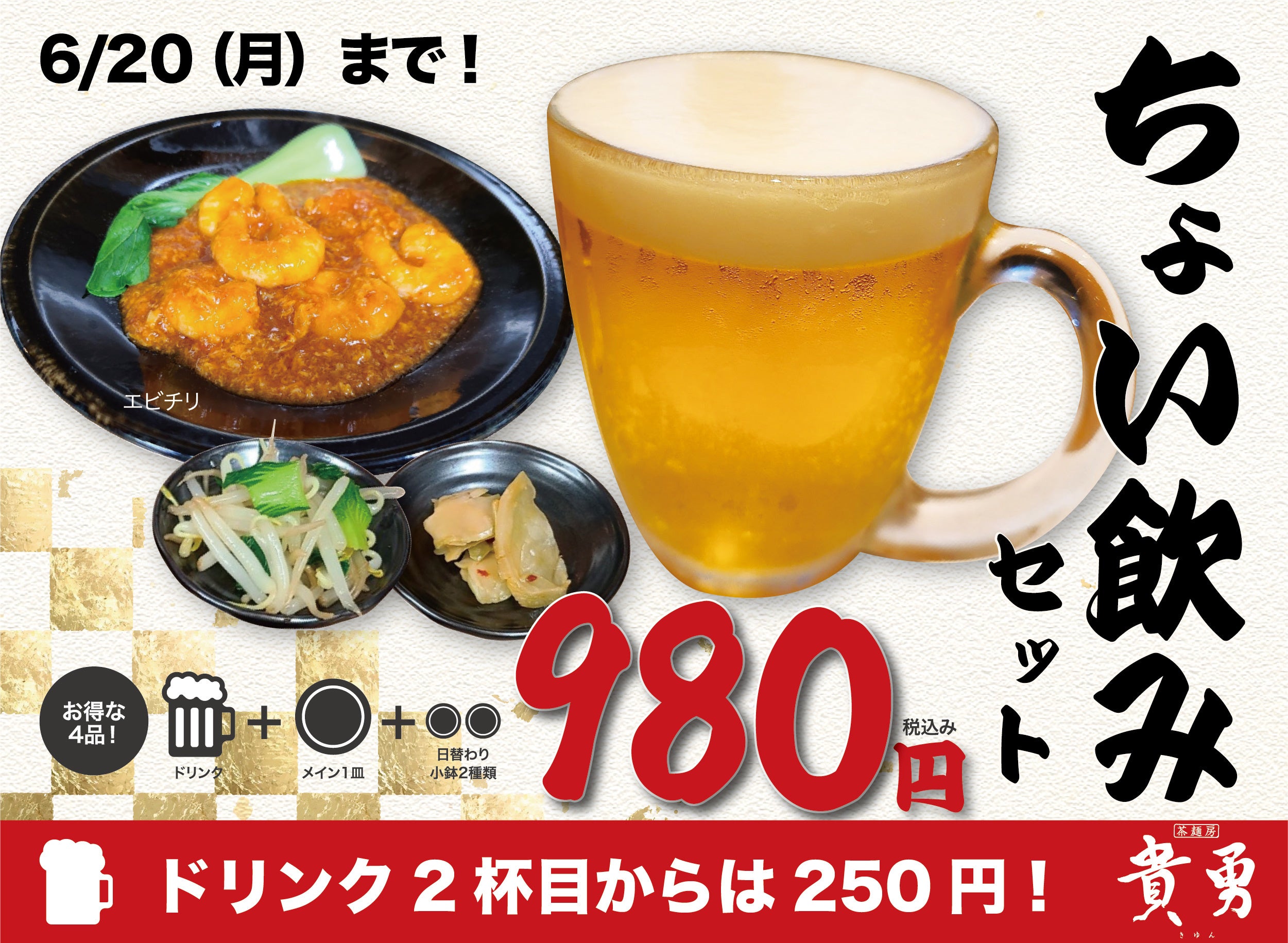 株式会社クロコ(本社:東京都中央区、代表取締役:大和田大地)が運営する「茶麺房 貴勇(さめんぼう きゆん)」にて、仕事帰りの一杯に嬉しい「ちょい飲みセット」980円(税込み)を6月20日(月)まで販売いたします。