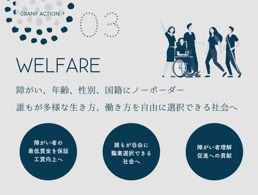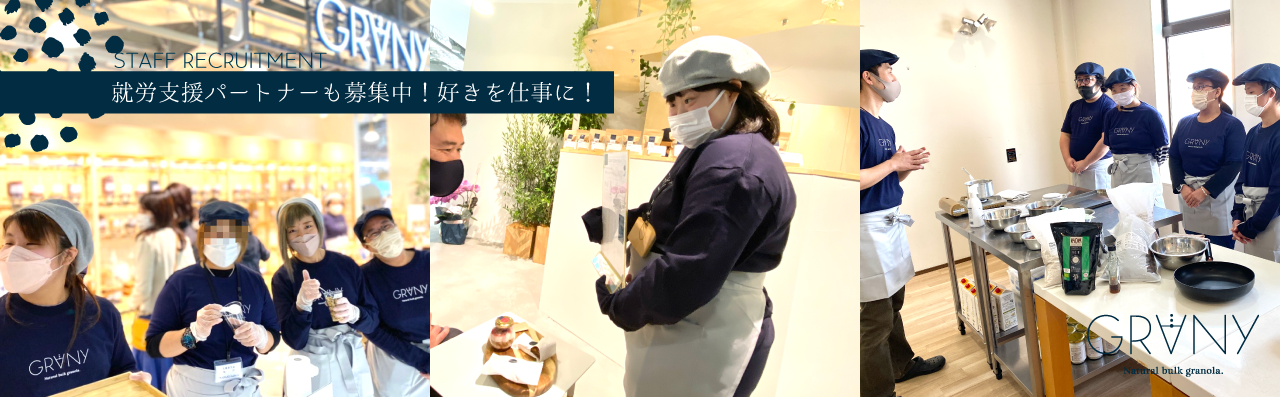 GRANYは、障がいのある方をパートナーとして迎え共に運営しています。 私たちは、障がい者 ”支援 ”をすることが 「社会貢献」となるのではなく、障がい者が社会貢献できる「働き方」「環境」を創り出すことそのものが「社会にとって大きな財産」になると考えています。障がい者の工賃向上や職業選択の自由などの環境が整い、当たり前のように利用する店やサービスでそれぞれが関わり合うことで理解し合える、多様性社会がスタートすると考え、GRANYからこのアクションとイノベーションを起こします。また、「自分の仕事が社会に貢献している」という気持ちをそれぞれが持つことで、仕事へのやり甲斐、生き甲斐、生活する上での潤いを持つことができます。共に社会課題を解決するチームとなり「それぞれの役割が社会に貢献している」という尊厳を感じながら、多様な働き方やお互いを認め合える環境づくりを大切にしています。