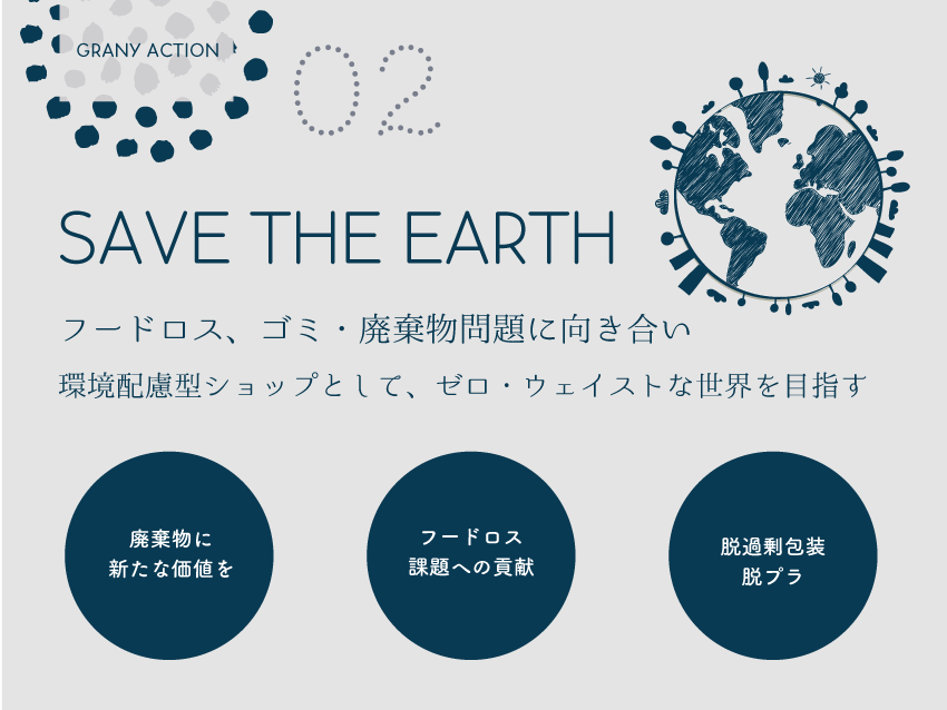世界中問題視されている環境問題は私たち人間にとってもう見て見ぬふりできる問題ではなくなってきています。世界では毎年13億トンあまりが廃棄され、日本でも年間約2,550万トンの食品が廃棄されており、その中にはまだ食べられるにも関わらず捨てられた” フードロス” も大きな課題です。 食品ロスの大きな原因は、作り過ぎ、売れ残り、食べ残し。 GRANYではこの課題に正面から取り組むことを決意。 現在の大量生産・大量消費・大量廃棄の社会経済システムから抜け、バルク販売による「最適生産・最適消費・最小廃棄」をモットーに持続可能な循環型生産販売に取り組んでまいります。また、 GRANYでは過剰包装はせず、デポジット容器の提案や、包装や梱包などにも再生紙、リサイクル、アップサイクル製品を活用、マイ容器やマイバックのご利用を推奨、ゼロ・ウェイストな世界に貢献できるお店を目指してまいります。様々な側面から環境配慮を試みながら、エシカル消費や環境意識のスモールステップとなれるよう運営しています。