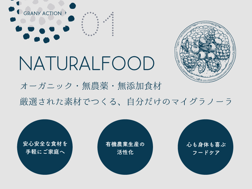 GRANYのグラノーラはオーガニック・無農薬・無添加食材を中心に、安心・安全な食材を使用し、ご家庭でも気軽に健康的な食材を取り入れられることを目指します。自社キッチンにて保存料を使わず一つ一つ手作りで加工しているためお子様にも安心して食していただけます。グラノーラの栄養価をしっかり吸収していただくために、人工甘味料や白砂糖などの余計なものは使用せず、素材の旨みや自然の恵を活かした商品を取り揃えています。また、有機・無農薬食材を活用し有機農業者の活性化、地域再生などにも貢献し、安心できる食材の流通を増やし、ご家庭でのフードケアという健康的な食事の後押しをしたいと考えています。自分にとって必要な量や必要な物をじっくり考える余白ができることは「自分を大事にすること」につながります。本当に必要なものを必要な分だけ購入できること。少しの冒険も気軽にできること。GRANYでは食を通して、お客様の時間と生活と健康を大切にできるお店を目指します。