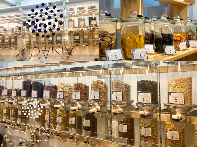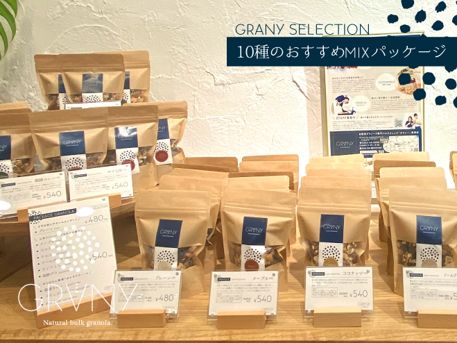 GRANYでは、無農薬、オーガニック素材を中心としたグラノーラを量り売りにて提供。厳選素材を自社キッチンにて手作りで製造。現代の日本では馴染みが低い Bulk(量り売り)ショップとなります。20gからの量り売りバルクコーナーにはオススメのフレーバーベース14種〜、その他ナッツやドライ野菜やドライフルーツが40種以上が並びます。お客様はその中からお好みのグラノーラを作ることができます。実際に素材を見て、試食していただきながら、お好みにあった素材やフレーバーをお選びいただけます。廃棄される不揃いの野菜や果物を活かした『おかずグラノーラ』では「薬膳カレー」味や、名古屋名物八丁味噌でつくる「みそ七味」など様々なフレーバーをお楽しみいただけます。(※栄マルエイガレリア店とは並ぶ素材が異なる場合がございます)