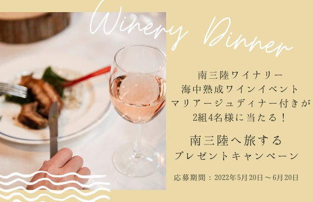 一般社団法人南三陸町観光協会では、2022年5月20日(金)~6月20日(月)の期間、南三陸町観光協会が発行するメルマガにご登録いただいたお客様に、南三陸でしか味わえない料理とワインを満喫いただける『南三陸ワイナリーディナー』へ抽選でご招待する特別企画を実施いたします。