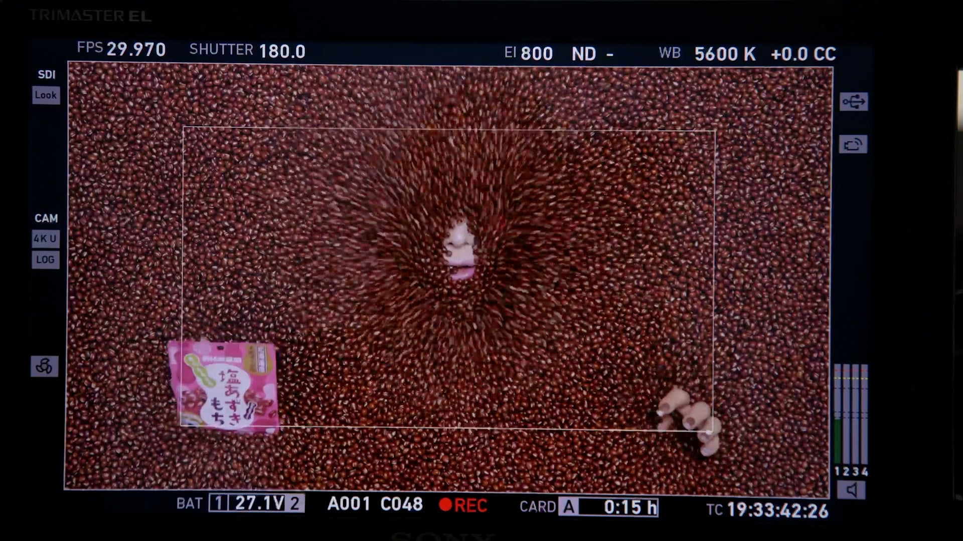 今回Mattさんに大量のあずきにハマっていただくため、特別な装置を作成。実際にあずきの中から顔と手を出して撮影を行いました。現場で首や手の位置を調整し、埋もれること数時間!耳まわりにあるあずきのくすぐったさと格闘しながら、演技をしていただきました。お顔全体があずきの中に吸い込まれるシーンもリアルで撮影をしています。