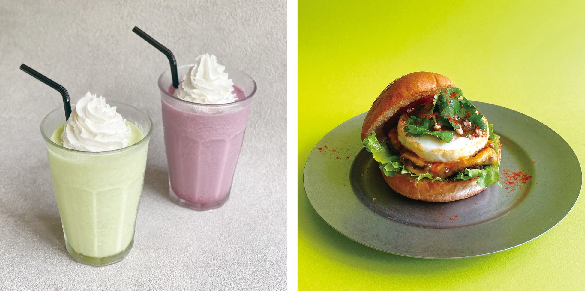 ※(左より)「マスカットシェイク」、「ラズベリー&クランベリーシェイク」、「パクチーバーガー」