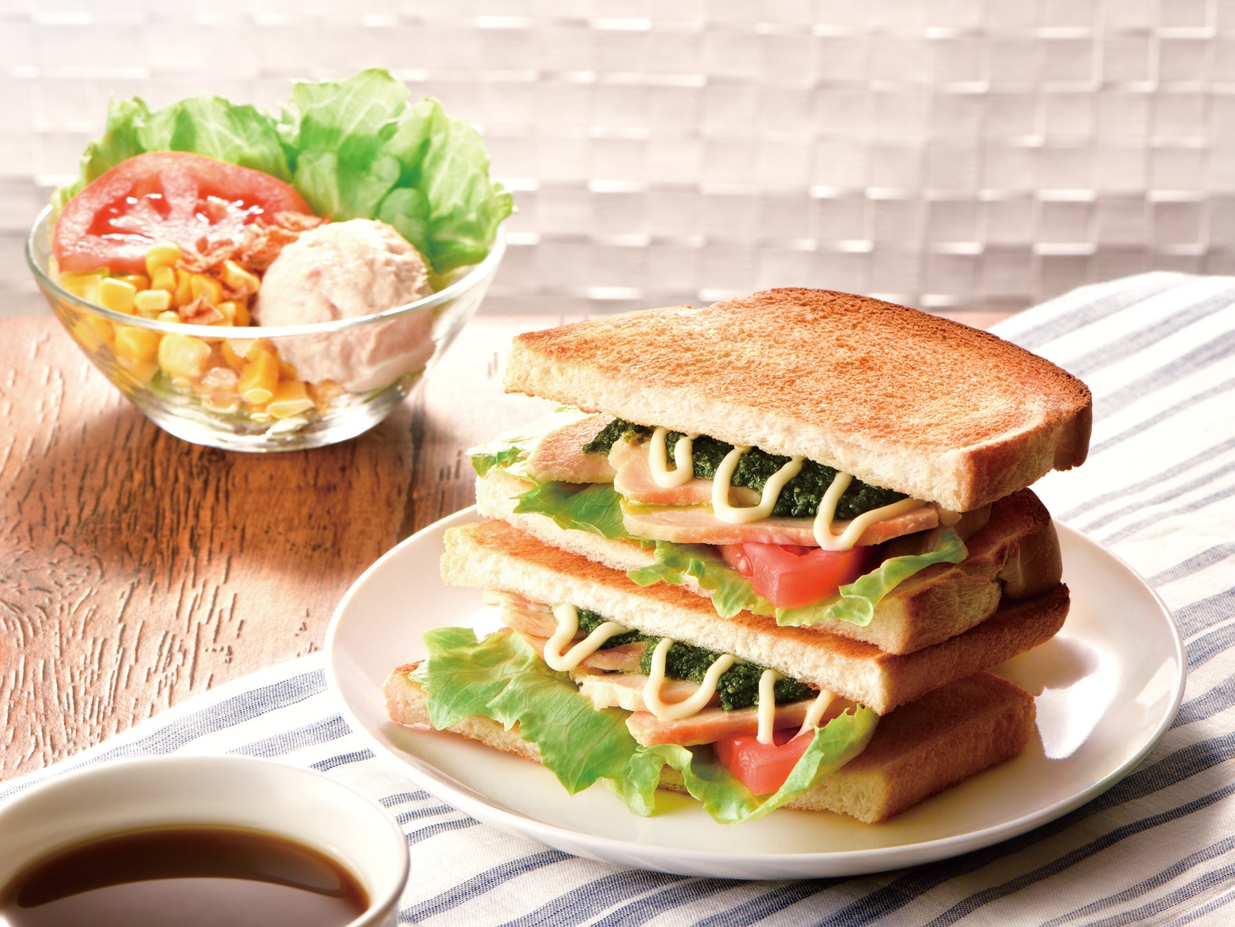 フードメニュー「トーストサンド 宮崎日南どりの大葉ソース」は、宮崎県産の銘柄鶏「日南どり」のローストチキンに、香りゆたかな大葉ソースをトッピングした、初夏にぴったりの爽やかな味わいのサンドです。大葉ソースにはチーズとガーリックを加え、コクと旨みも感じられる味わいに仕立てました。しゃきしゃきのレタスとフレッシュなトマトをあわせることで、さっぱりとお召し上がりいただけます。