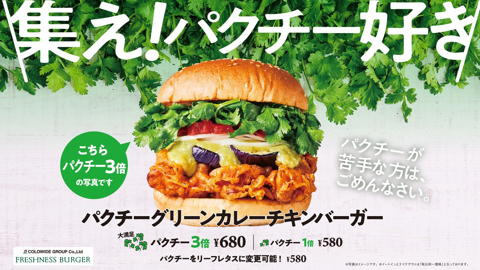 コロワイドグループの株式会社フレッシュネス(代表取締役社長:齋藤 健太朗/本社:神奈川県横浜市西区)は、2022年5月25日(水)より、ハンバーガーチェーン「フレッシュネスバーガー」にて、こぼれる程のパクチーと本格的なグリーンカレーソースをサンドしたパクチーグリーンカレーチキンバーガーを期間限定発売いたします。