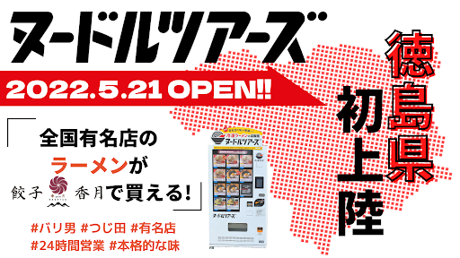 業務用麺類製造を行う株式会社丸山製麺 (本社:東京都大田区、代表取締役:丸山和浩、以下「丸山製麺」)が運営する、日本初の東京の有名店のラーメンが購入できる冷凍自販機「ヌードルツアーズ(https://noodle-tours.com/)」が、徳島県を拠点に数々の飲食直営店やFC店舗を展開する株式会社ふじや(https://www.fujiyanet.co.jp/)と業務提携を行いました。5月21日(土)から、ふじやが展開する無人餃子店舗「餃子香月(https://www.kagetsu-gyouza.com/)」の徳島エリア(餃子香月 石井店/北島店)2店舗同時販売開始致します。順次7店舗で「ヌードルツアーズ」の販売を予定しています。
