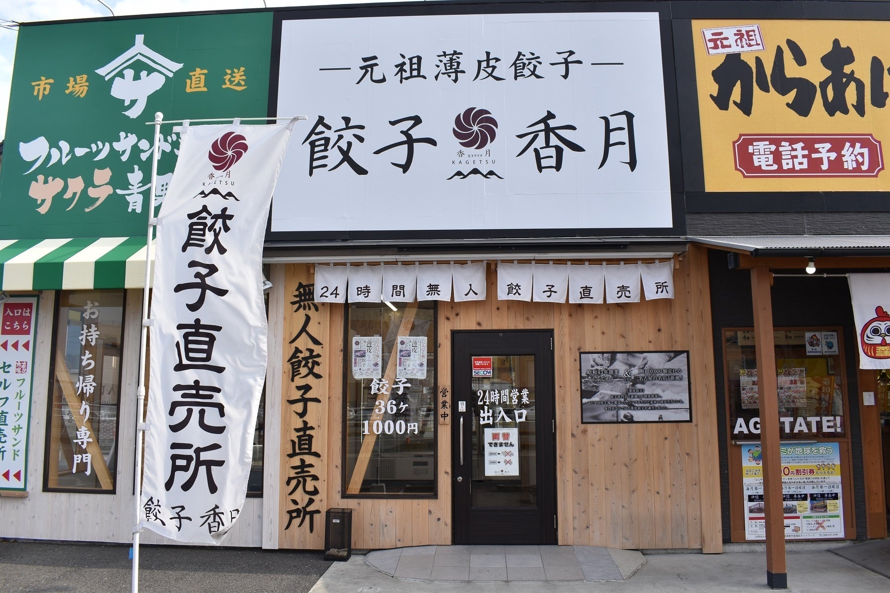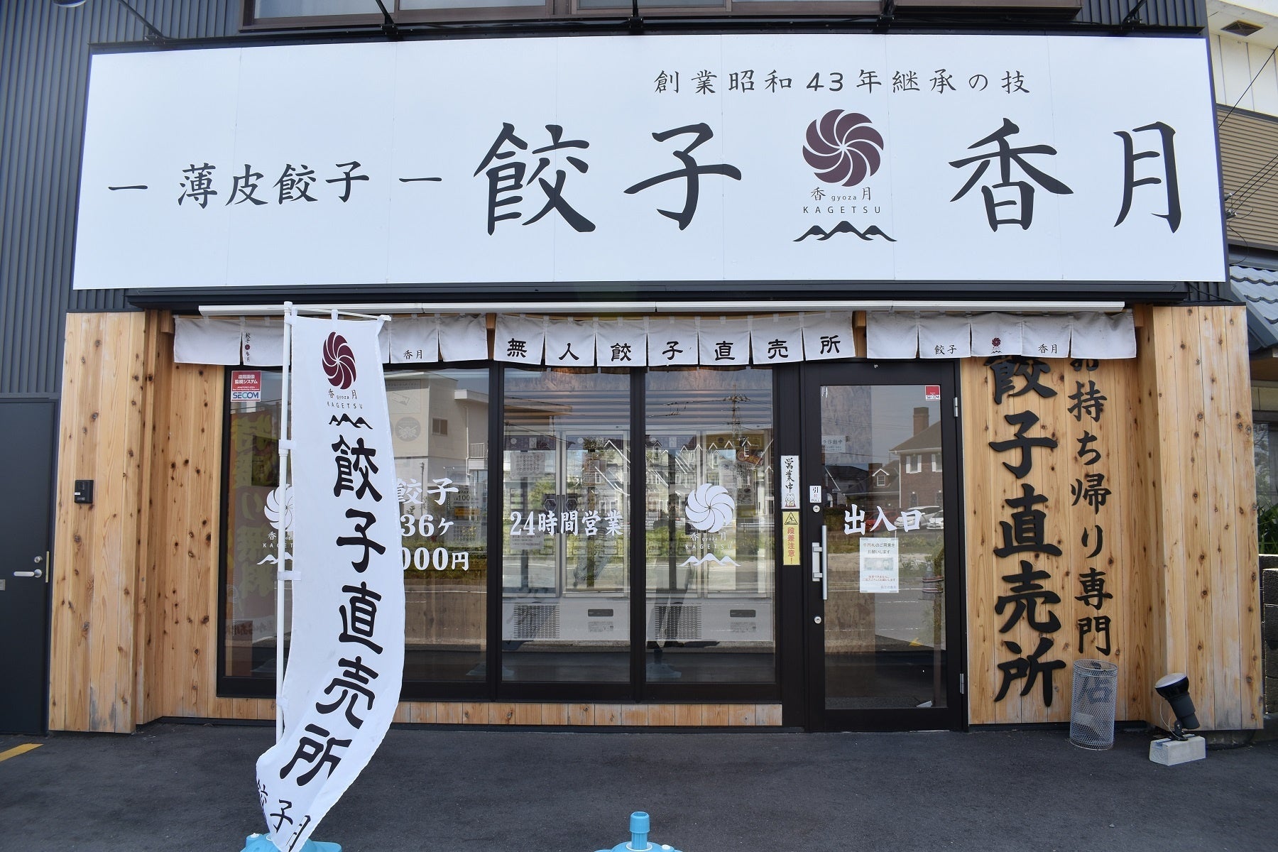 工場直売の冷凍薄皮餃子を購入できる無人直売店舗。店員がおらず、冷凍ケースから商品をとりだし、料金箱に料金を入れるだけの非接触スタイル。