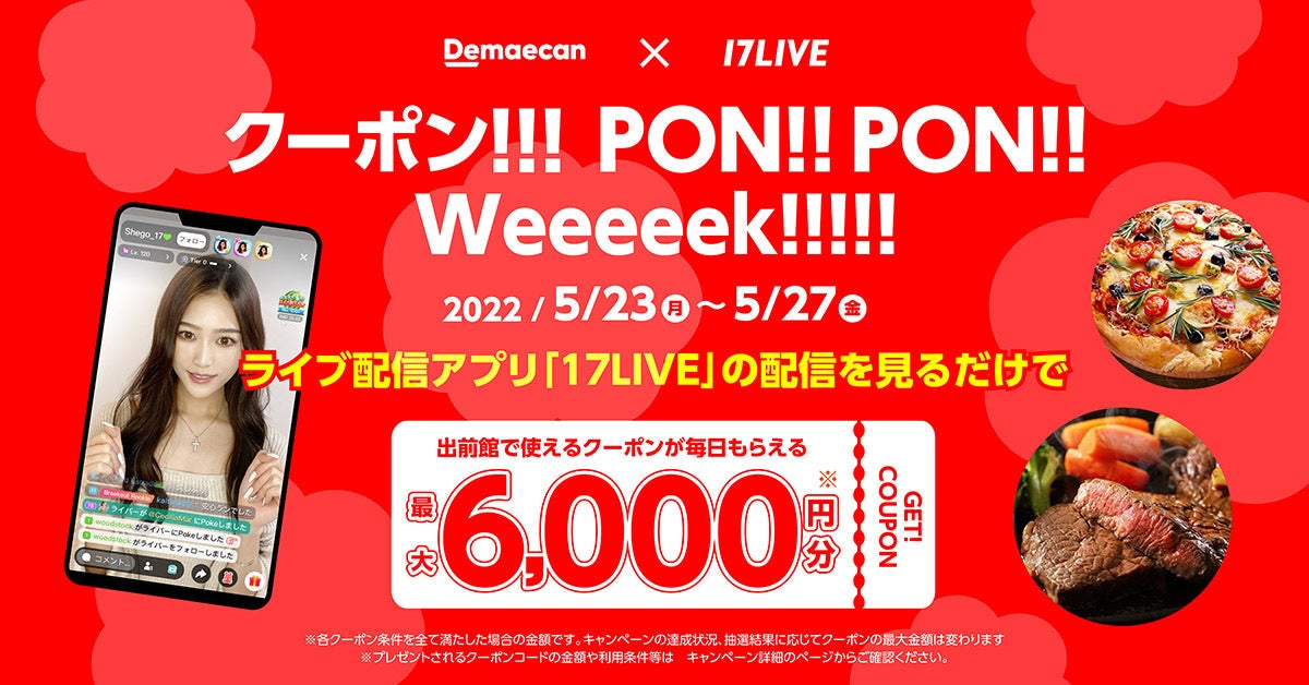 17LIVE株式会社(東京都港区、代表取締役:小野 裕史、URL:https://jp.17.live/)が運営する日本No.1(※1)ライブ配信アプリ「17LIVE」では、株式会社出前館(東京都渋谷区、 代表取締役社長:藤井 英雄、URL:https://demae-can.com/ )が運営する日本最大級のデリバリーサービス「出前館」と、初のコラボレーション企画となる『出前館 × 17LIVE クーポン!!!PON!!PON!!Weeeeek!!!!!』を開催することが決定しましたので、お知らせいたします。本キャンペーンは、指定の条件を満たすだけで「出前館」のアプリ内で利用可能なクーポンが入手できるキャンペーンとなり、2022年5月23日(月)から 5月27日(金)の5日間にわたり実施いたします。