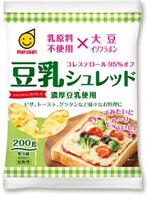 「豆乳シュレッド」は豆乳を使用して作ったチーズ風食品です。乳原料不使用、コレステロール95%オフ(※)で、チーズと同じ料理に使用していただけます。大豆を活用した食材は、動物性食品にくらべて地球環境にも優しいとされています。