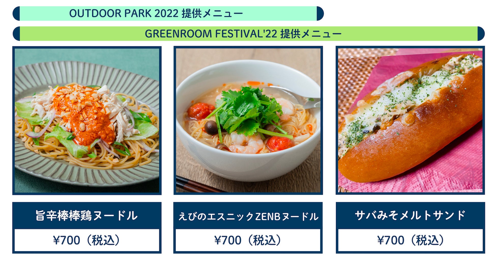 「OUTDOOR PARK 2022」では、ZENBヌードルを使用した「旨辛棒棒鶏ヌードル」、「えびのエスニックZENBヌードル」を提供いたしま。スパイスが効いた味付けで満足感のある麺料理ですが、豊富な食物繊維と植物性たんぱく質を含んだZENBヌードルを使用しているため、さっぱりとお召し上がりいただけます。