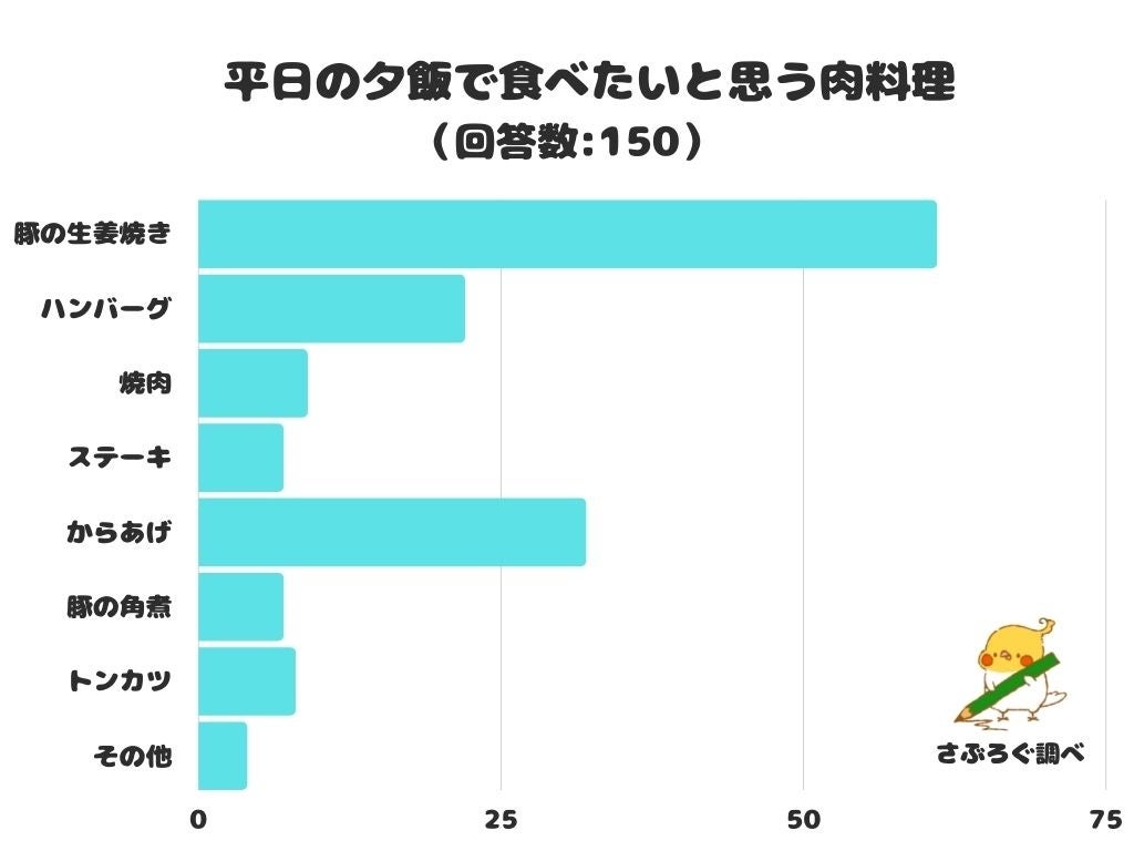 平日の夕飯で食べたいと思う肉料理をアンケートにて調査したところ、1位は「豚の生姜焼き」でした。