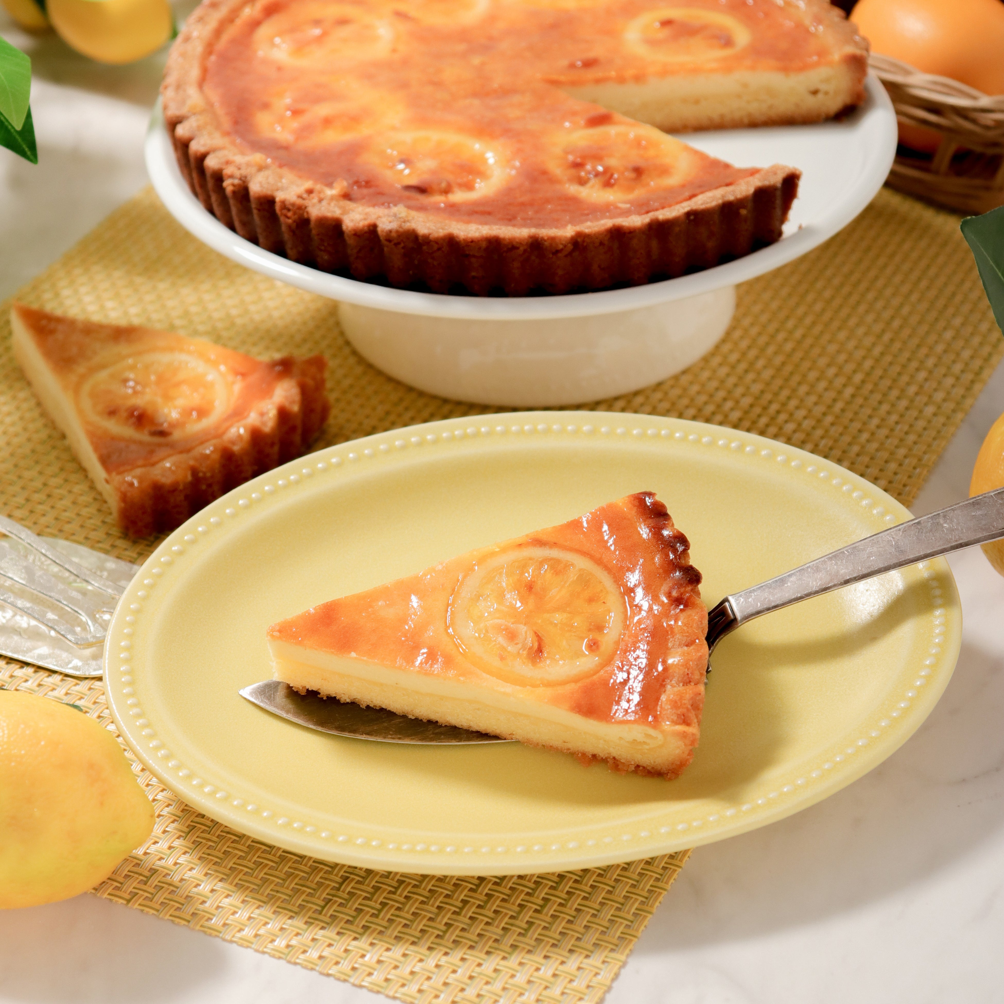 レモンをあわせたチーズクリームをタルト生地に流し込み、シロップ漬けのレモンスライスをのせたチーズケーキ風のレモンタルト。