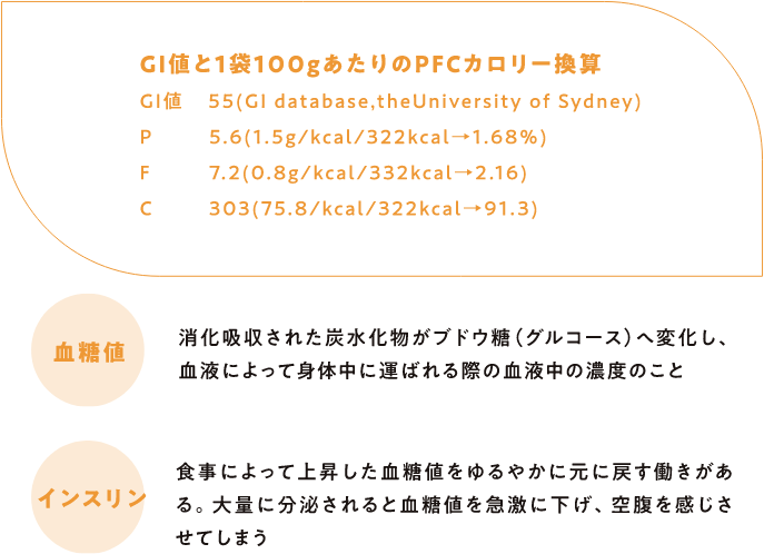 マッスルポテトのGI値は55。これは玄米やそばと同じくらいの数値と低く、糖質の吸収やインスリンの分泌を穏やかにし、空腹を感じにくくします。