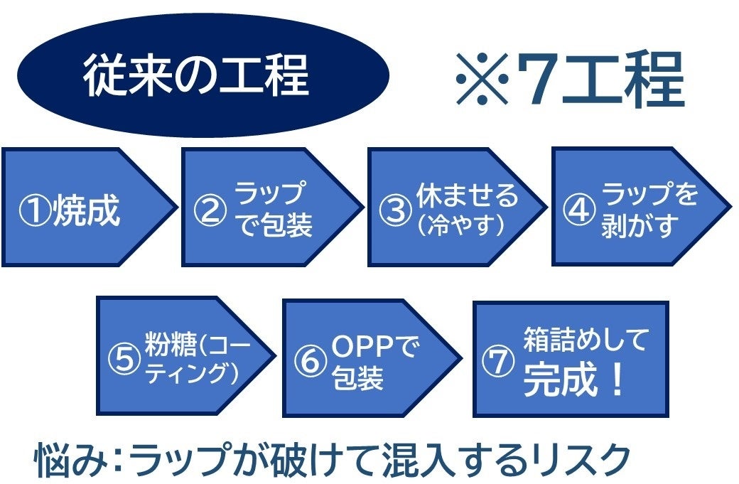 従来は粉糖が溶けて固まるため、最終梱包の前に加工をしていた。加工作業が焼成後と梱包前の2回に分かれるため、工程が複雑であった。