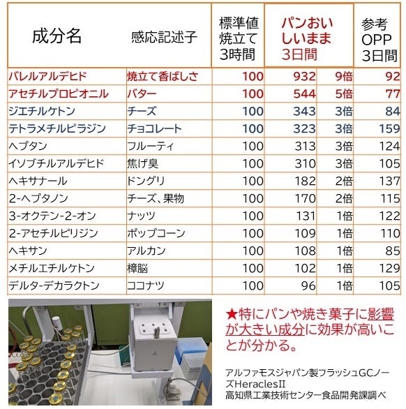 ▶店頭でそのまま3時間販売するより、「パンおいしいまま」に入れた方が、3日目後でも「焼き立ての香り」が濃厚であることが分かります。