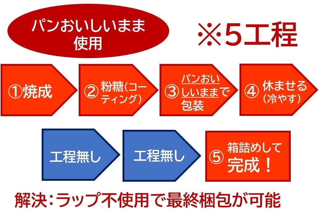袋を食品ラップから「パンおいしいまま」に変更することで、粉糖をコーティングしても溶けずに冷やすことが可能となったため、加工工程を焼成から粉糖処理まで一度で行えるようになった。
