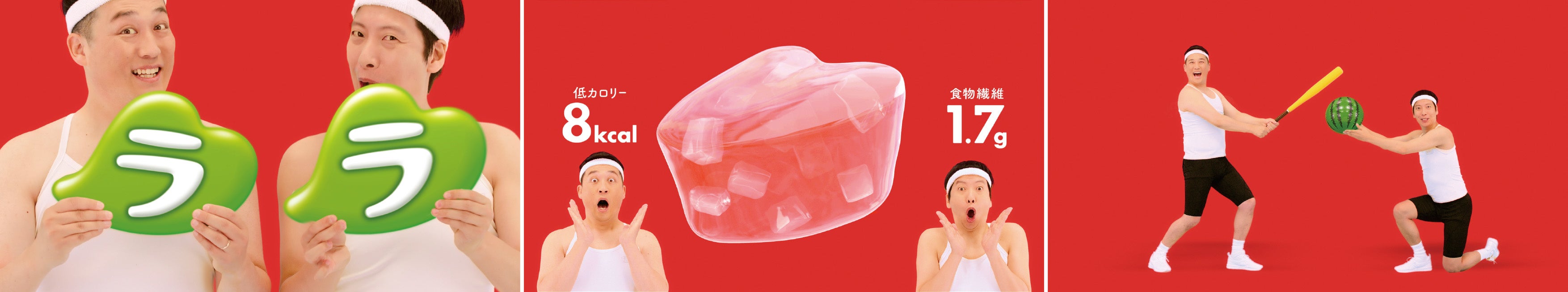 お馴染みのゼリー頭シリーズ第3弾となる今回のTVCMでは、お笑い芸人藤崎マーケットと男の子たちが“ラララライ体操”のリズムに合わせて「ララクラッシュ体操」を楽しく踊ります。前回ララクラッシュ頭だったトキさんもいよいよ!!??