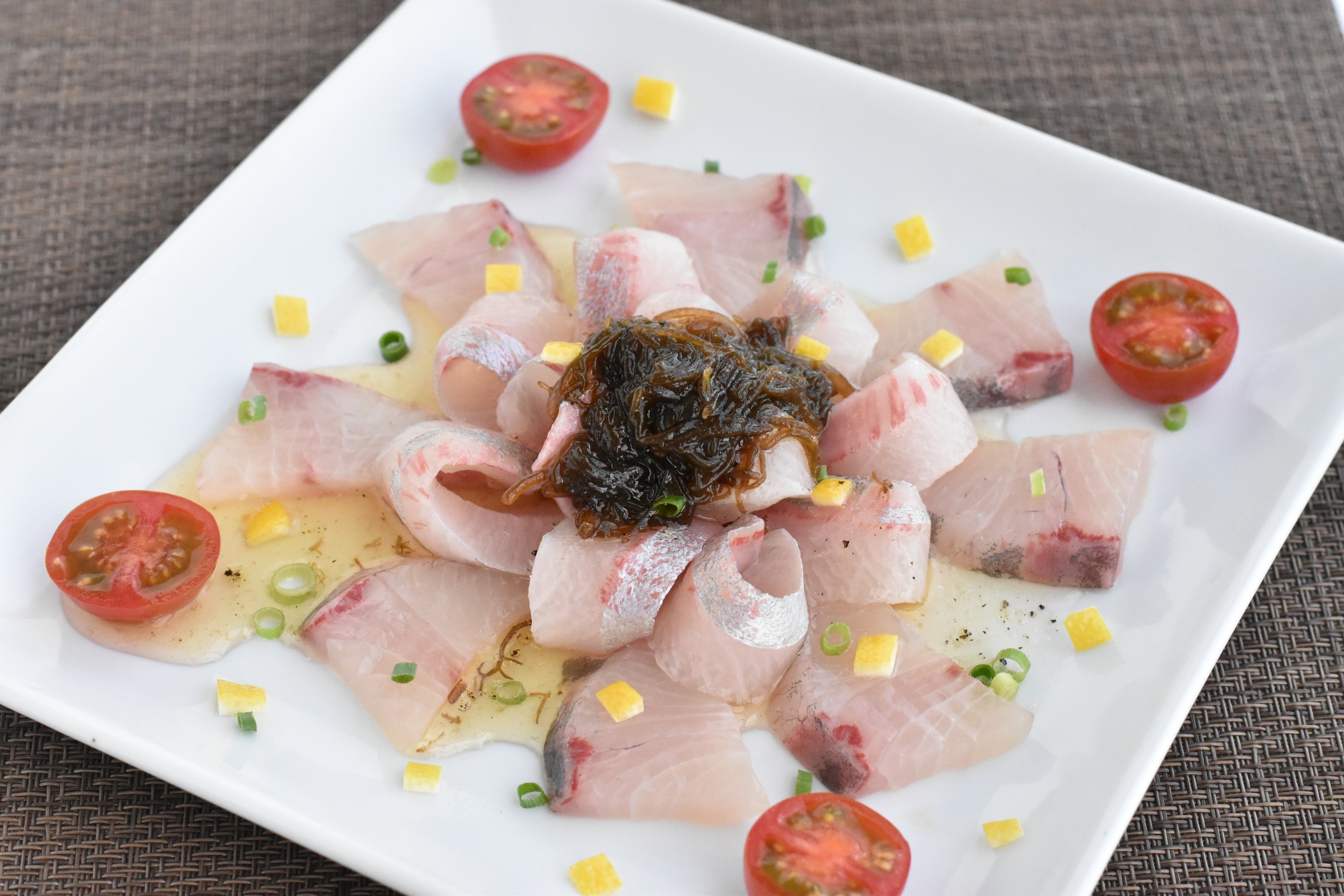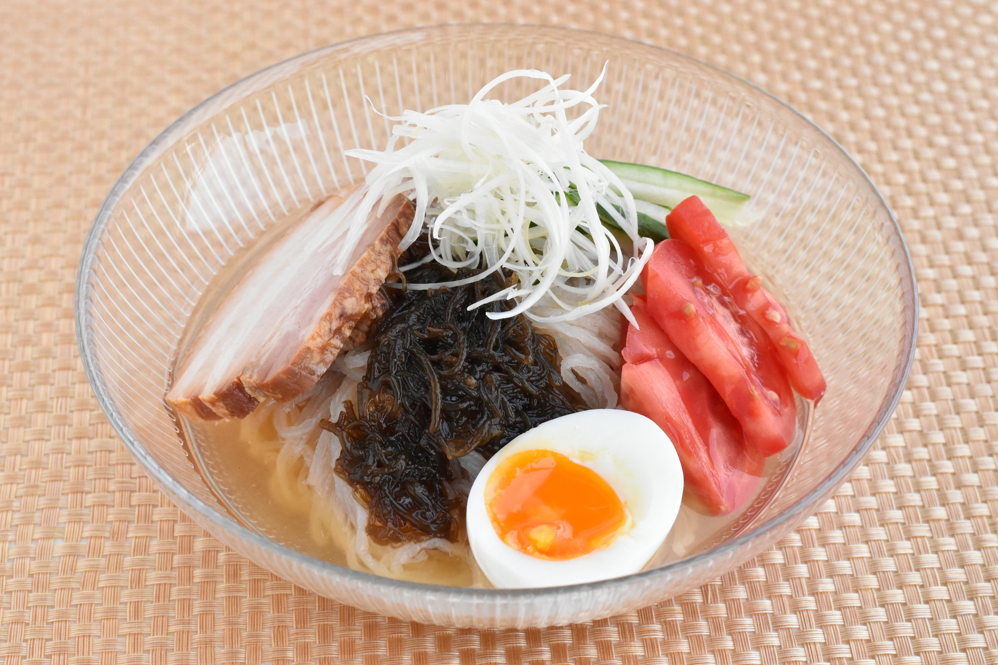 シークヮ―サーもずくを汁ごと使用。つるりとした冷麺にシークヮ―サーの酸味がマッチし、のどごしも爽やかなメイン料理に仕上がります。