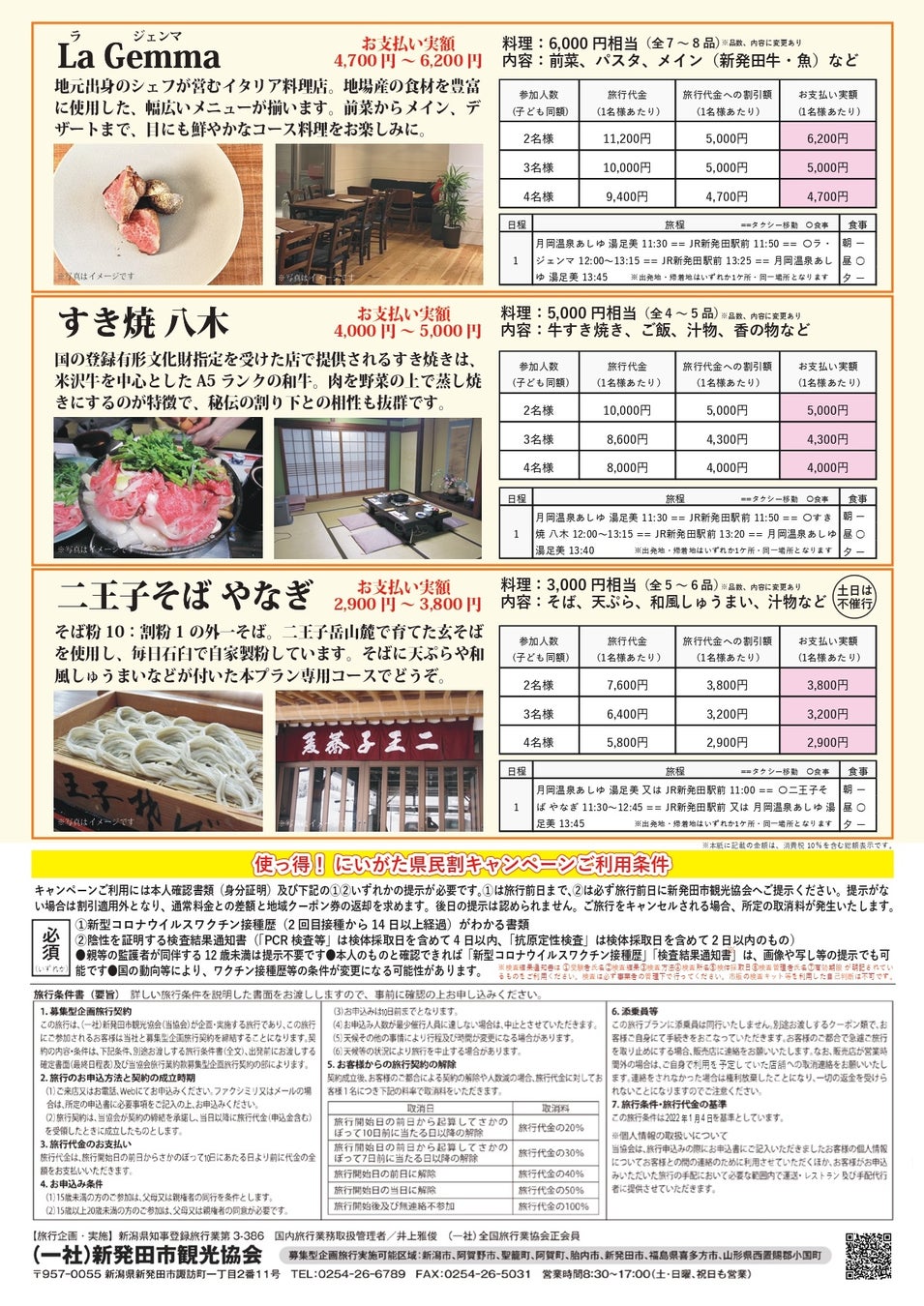 新潟県民からの割引額はお客様に支給されますが、当協会及び「使っ得!にいがた県民割キャンペーン事務局」がお客様に代わって受領(代理受領)いたします。お客様は、旅行代金に対する割引額を差し引いた「お支払い実額」をお支払いください。なお、お取り消しの際は、割引前の旅行代金を基準として所定の取消料を申し受けます。お客様は、当協会及び「使っ得!にいがた県民割キャンペーン事務局」による代理受領についてご了承の上お申し込みください。