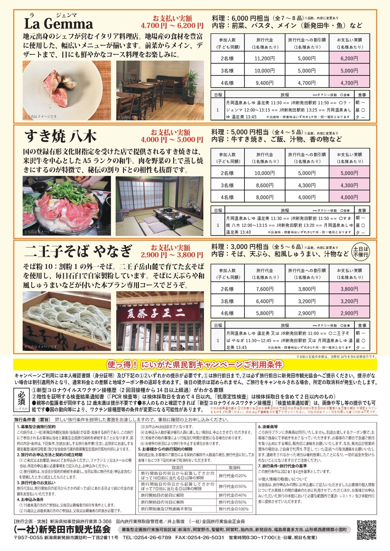 新潟県民からの割引額はお客様に支給されますが、当協会及び「使っ得!にいがた県民割キャンペーン事務局」がお客様に代わって受領(代理受領)いたします。お客様は、旅行代金に対する割引額を差し引いた「お支払い実額」をお支払いください。なお、お取り消しの際は、割引前の旅行代金を基準として所定の取消料を申し受けます。お客様は、当協会及び「使っ得!にいがた県民割キャンペーン事務局」による代理受領についてご了承の上お申し込みください。