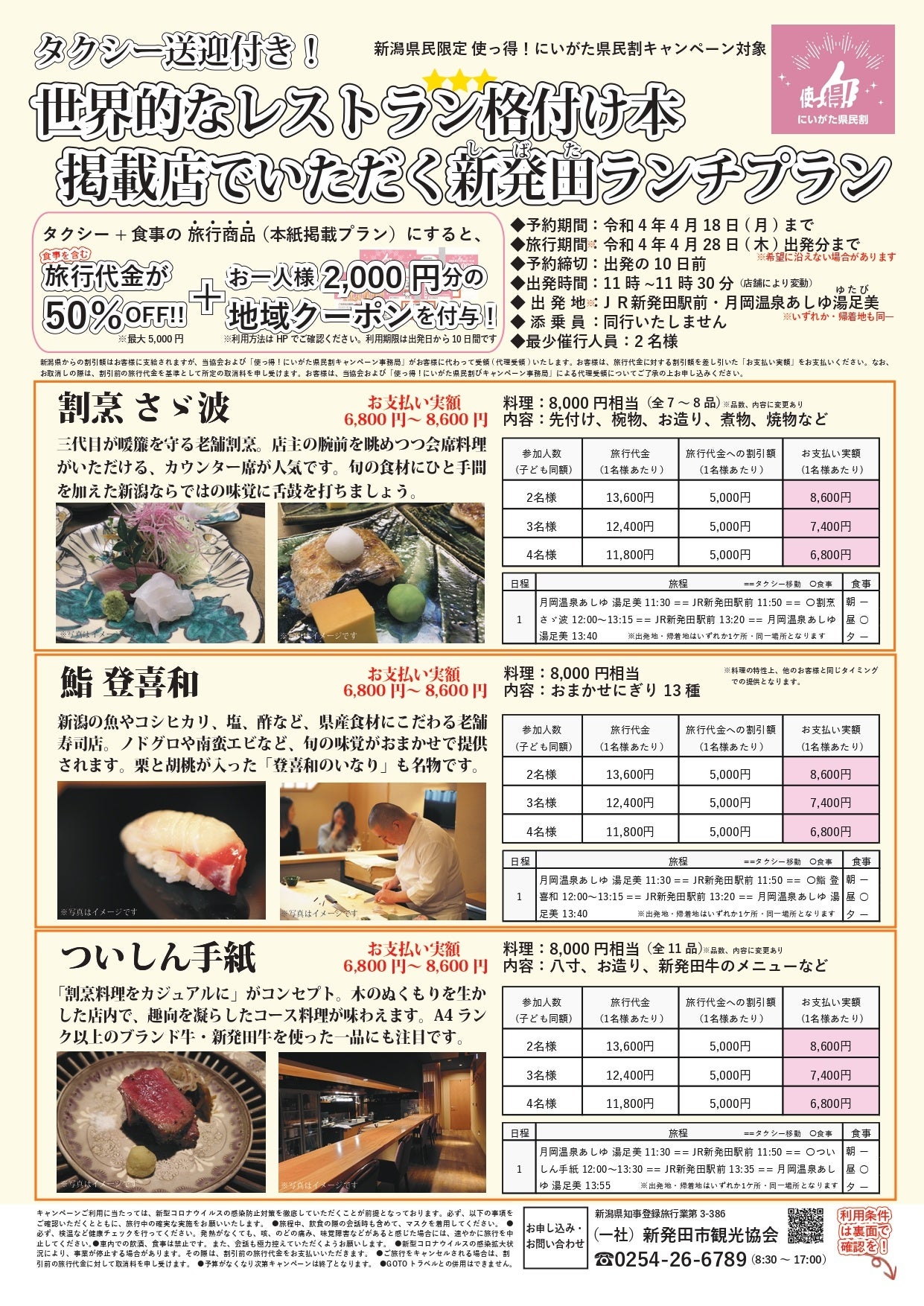 JR新発田駅または月岡温泉からタクシー往復運賃と食事代がセットになった募集型企画旅行商品です。5月31日(火)まで利用の新潟県民キャンペーンを活用したお得なプラン。新発田市が誇る厳選された料理をお楽しみください。