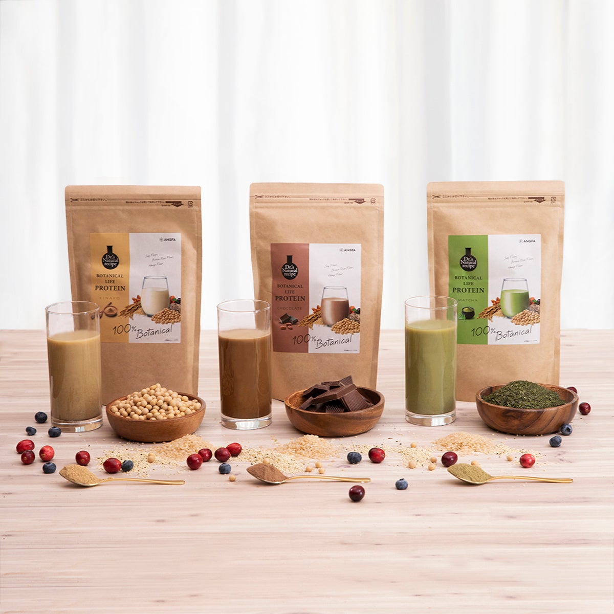 大豆・玄米・ヘンプのタンパク質に、ビタミンやミネラルを豊富に含む、アサイー、チアシード、スピルリナなど20種類のスーパーフード(※)を配合した、低糖質・低脂質なプロテインパウダー。毎日飲むものだからおいしさにもこだわって、定番のきなこ味のほかに、チョコレート味、抹茶味の3種類。